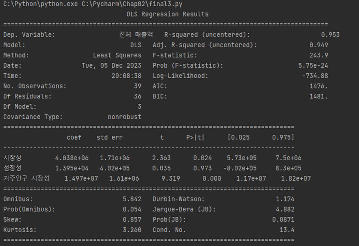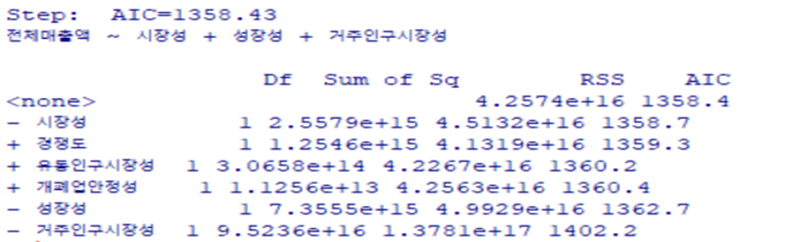 전진 단계별 선택법을 통해서 최종적으로 선택된 변수는 '거주인구 시장성'과 '성장성'이다.