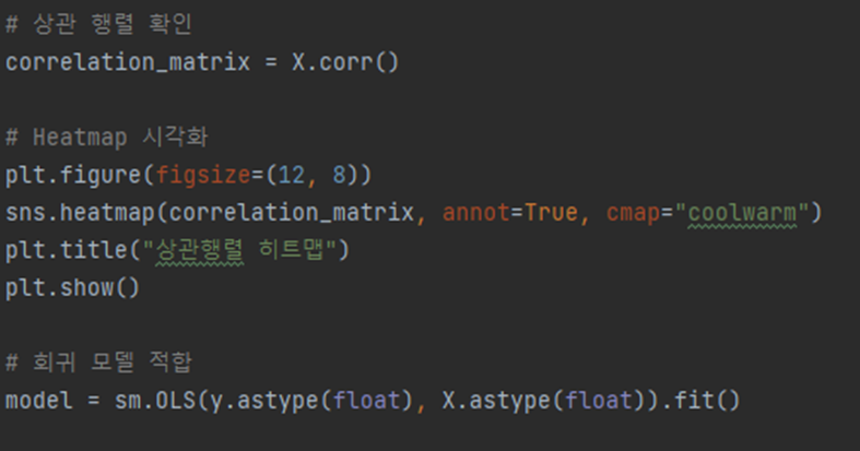 위 코드를 통해서 상관관계를 히트맵 형태로 시각화하였다.