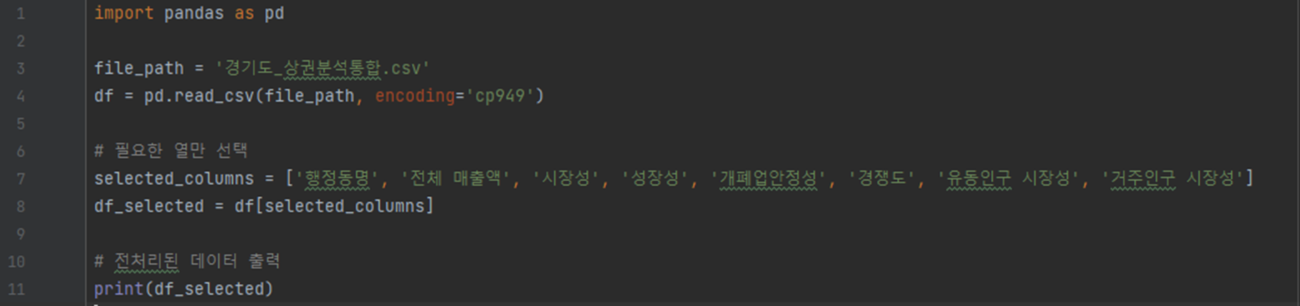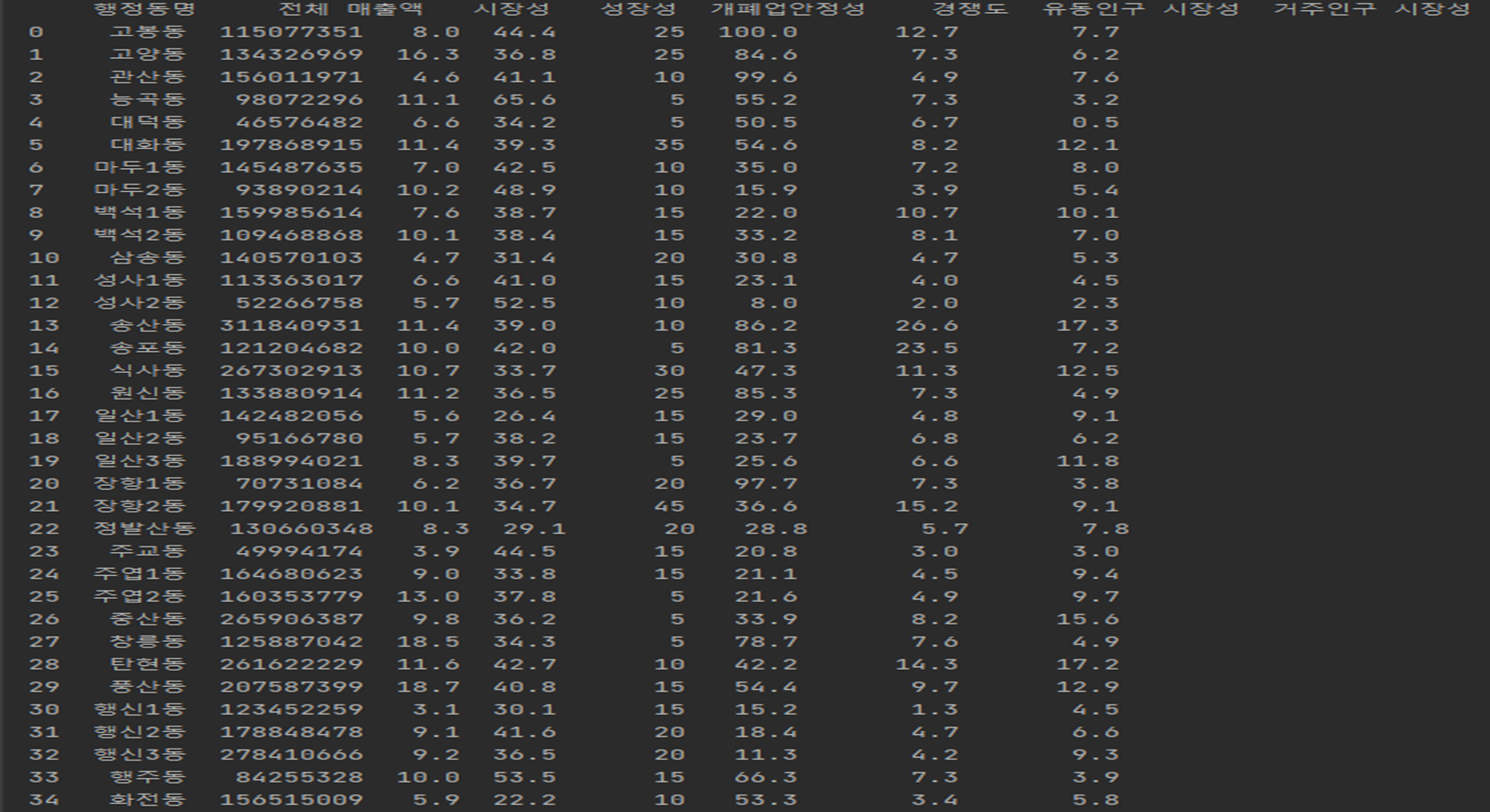 - 이를 통해 순위를 매겨 매점 확장 시 가장 매출이 높을 것으로 예상되는 행정동 순위 도출
