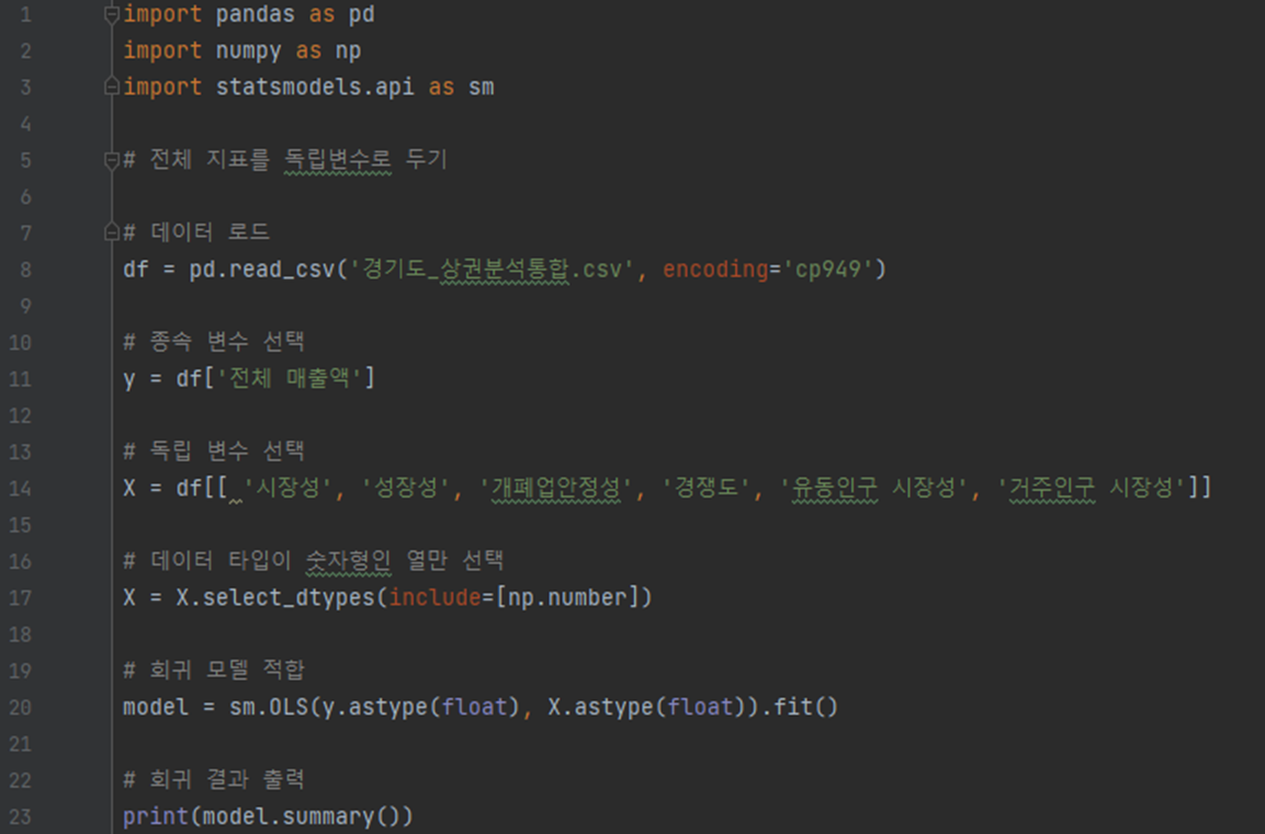 - 선형회귀분석(중회귀분석) 기법을 통해 데이터 분석