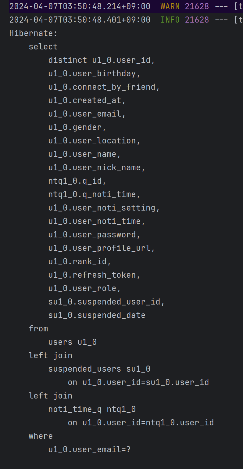 이때, 위 스크린샷과 같이 어떤 api를 통해서 User 엔티티를 호출해도 항상 다른 엔티티 2개(NotiTimeQ)와 SuspendedUser 엔티티를 조회하는 쿼리가 같이 나가는 문제가 있었습니다.