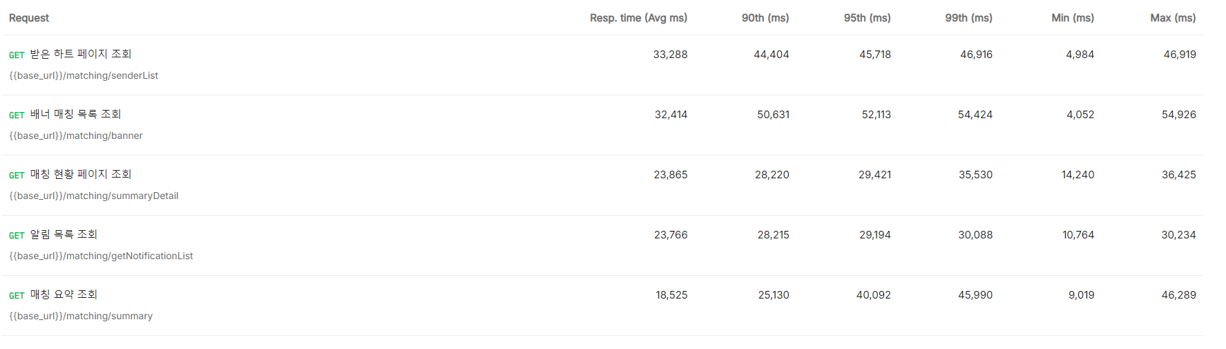 worst top 5 api는 전부 매칭과 관련된 API로 매칭과 관련해서