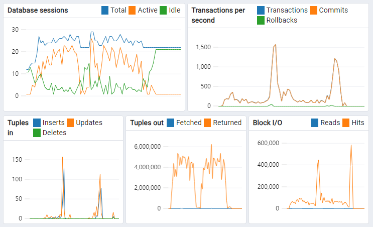 Tuples out이 계속 증가하다가 이후 CUD관련 API가 실행되면 이는 줄어들고 Tuples in이 되는 것을 볼 수 있다.