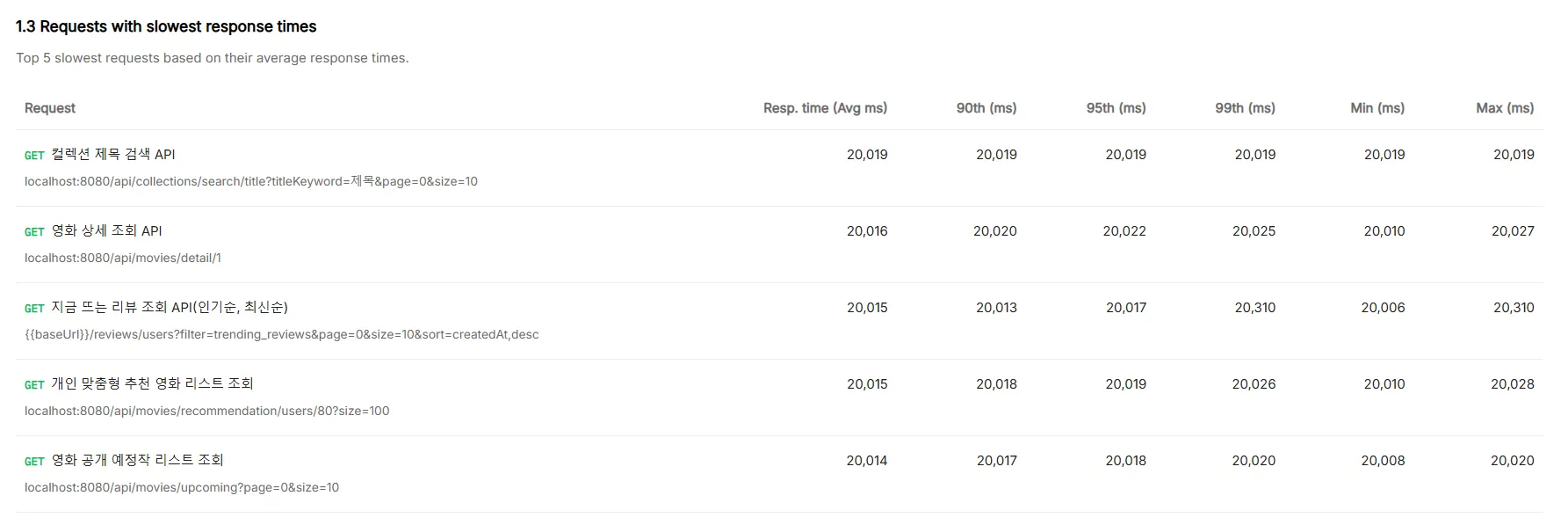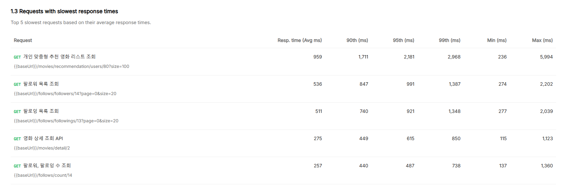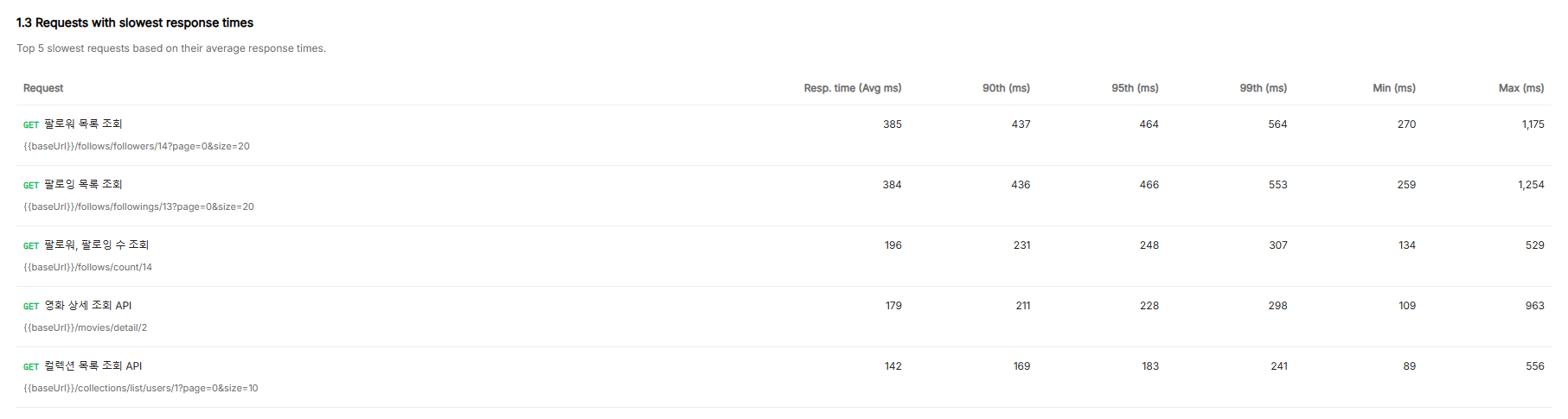 TTFB (Time To First Byte) 기준으로 평균 응답시간이 3초 이내로 들어오는 것을 목표로 했습니다.